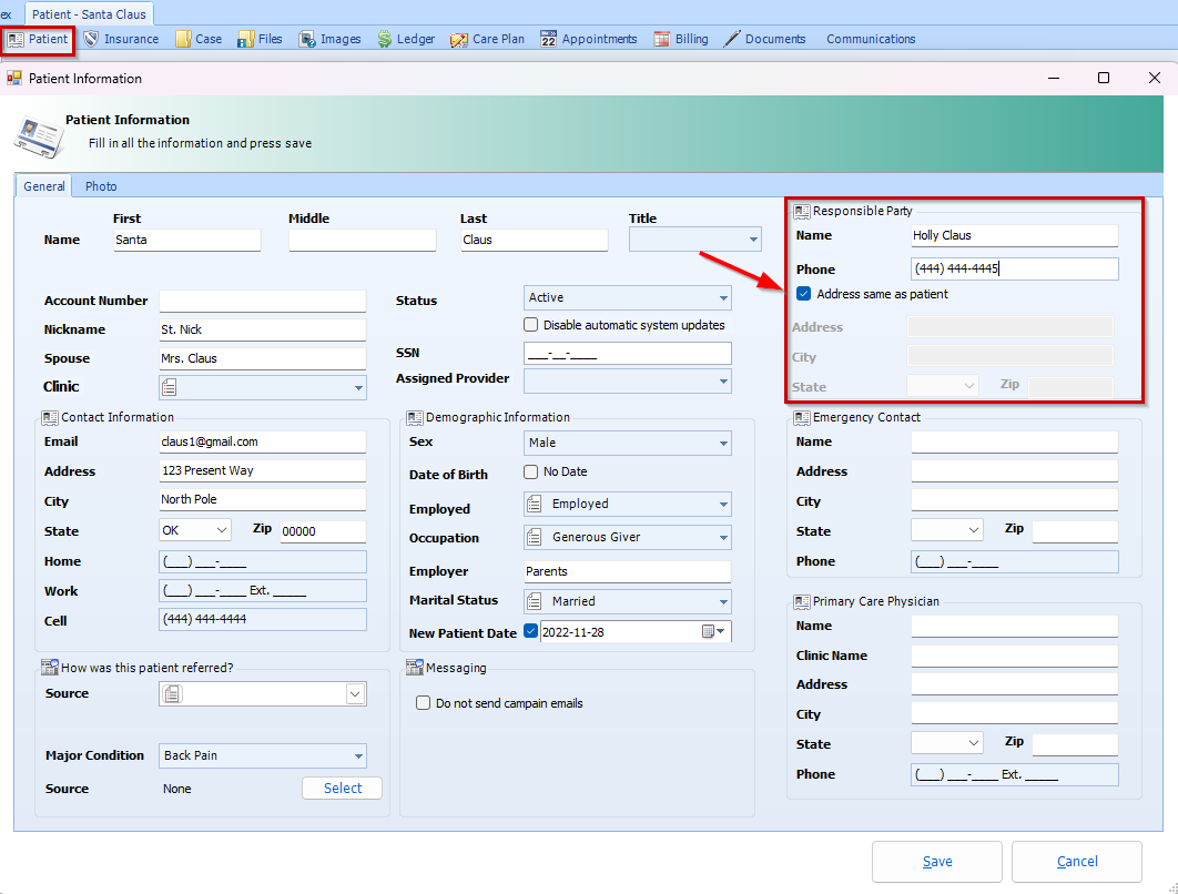 *In this Image example, Holly Claus is the Responsible party, but lives at a different address than Santa Claus. This is the address I would like displayed on Patient Statements generated for Santa Claus: