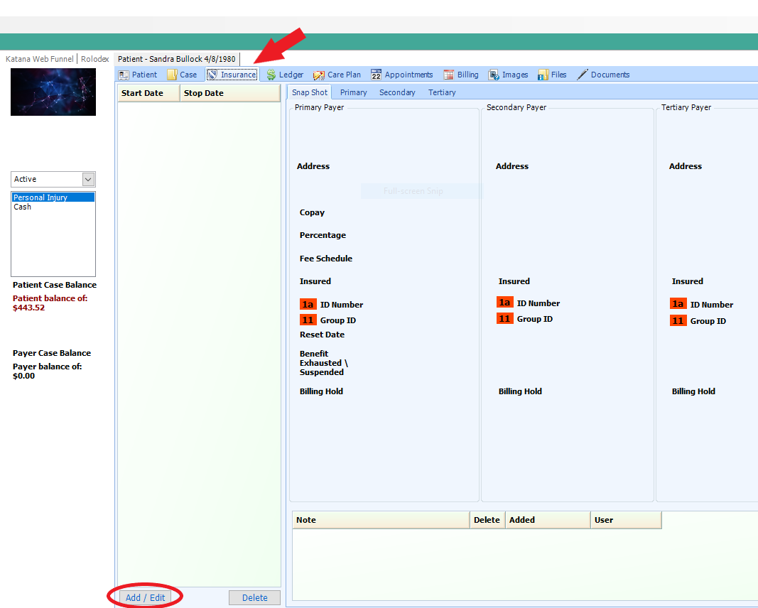 STEP 2: Go to the patient's Insurance Tab and Select ADD/EDIT button