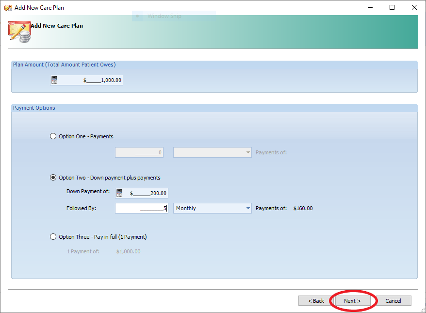 - b) Option Two- Down Payment plus payments - Add in the amount the patient is paying to start the plan today, followed by the number of payments they will be making and select the drop-down to indicate when the payment is to be collected. Weekly, Bi-Weekly, Monthly or Quarterly.