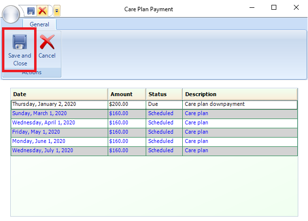 - Any Money Due on the Care plan will appear as a Care Plan Down payment, in Black.
