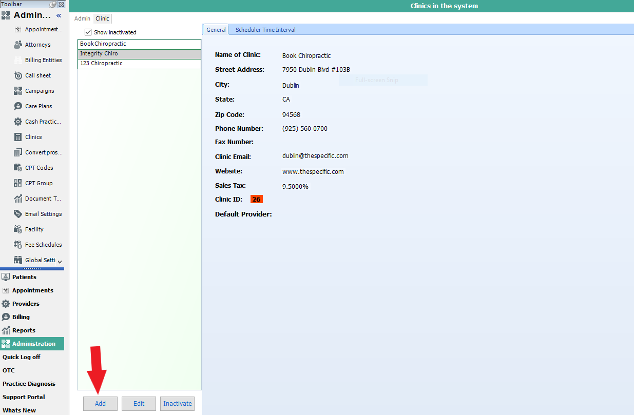 Please note: If you are setting up the software for the first time, it comes with a test clinic already added. Do not select ADD, Select Edit and replace info.