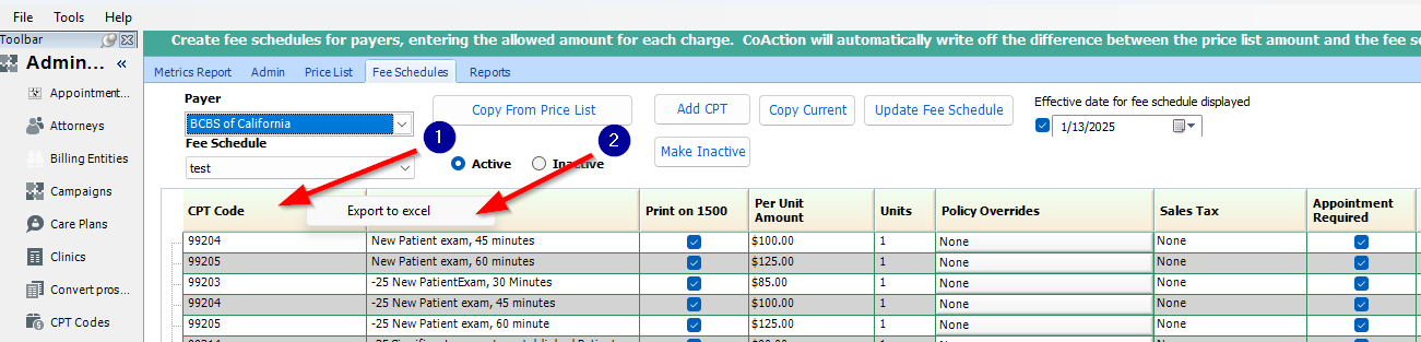 Please keep in mind, if you add a CPT to the Price List in the future, you will have to add that CPT code to each fee schedule created.