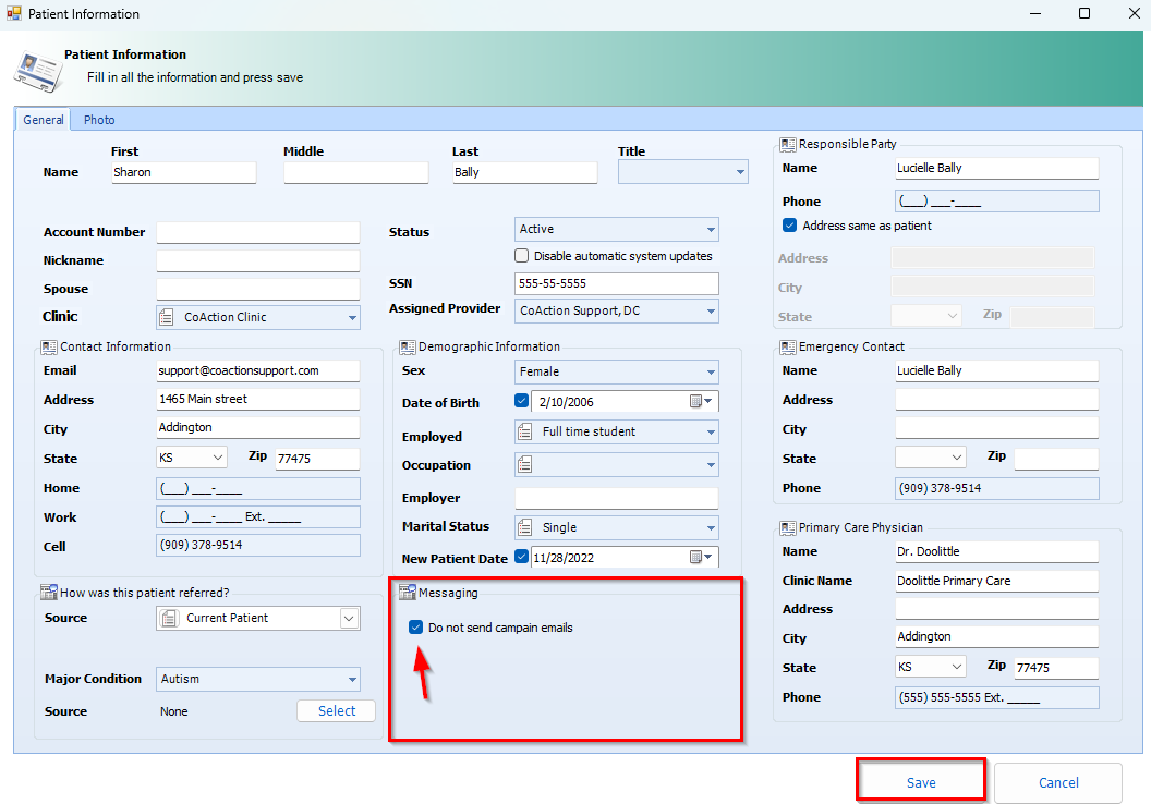 In this example, I do not want my patient to receive Email Campaigns(they will receive Text/Email Appointment Reminders and Text Campaigns)