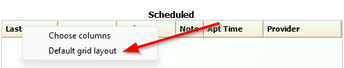- In each column: Scheduled, Arrived/Waiting, Checked In/Being Treated/Completed, right click on the column header and select "Default Grid Layout".