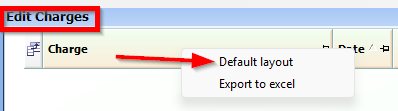 Fix: Within any patient appt>Edit Charges Panel>Right click Charge column and select Default layout